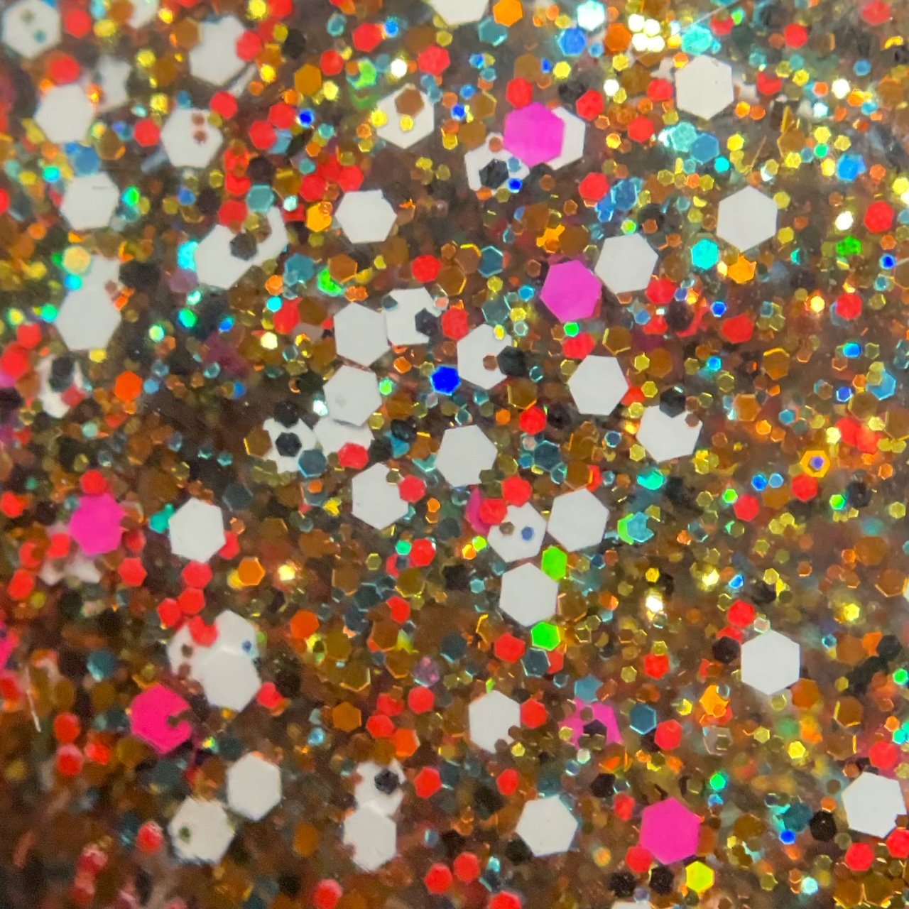 Tropical Pumpkins: a glitter bomb packed with fall colors in copper, gold, black, and orange, and bright turquoise, white, and neon pink. For those who aren’t quite ready to let go of summer, or live somewhere where it’s still hot, this is the perfect transition glitter. Can be worn as a topper or built up to full coverage
