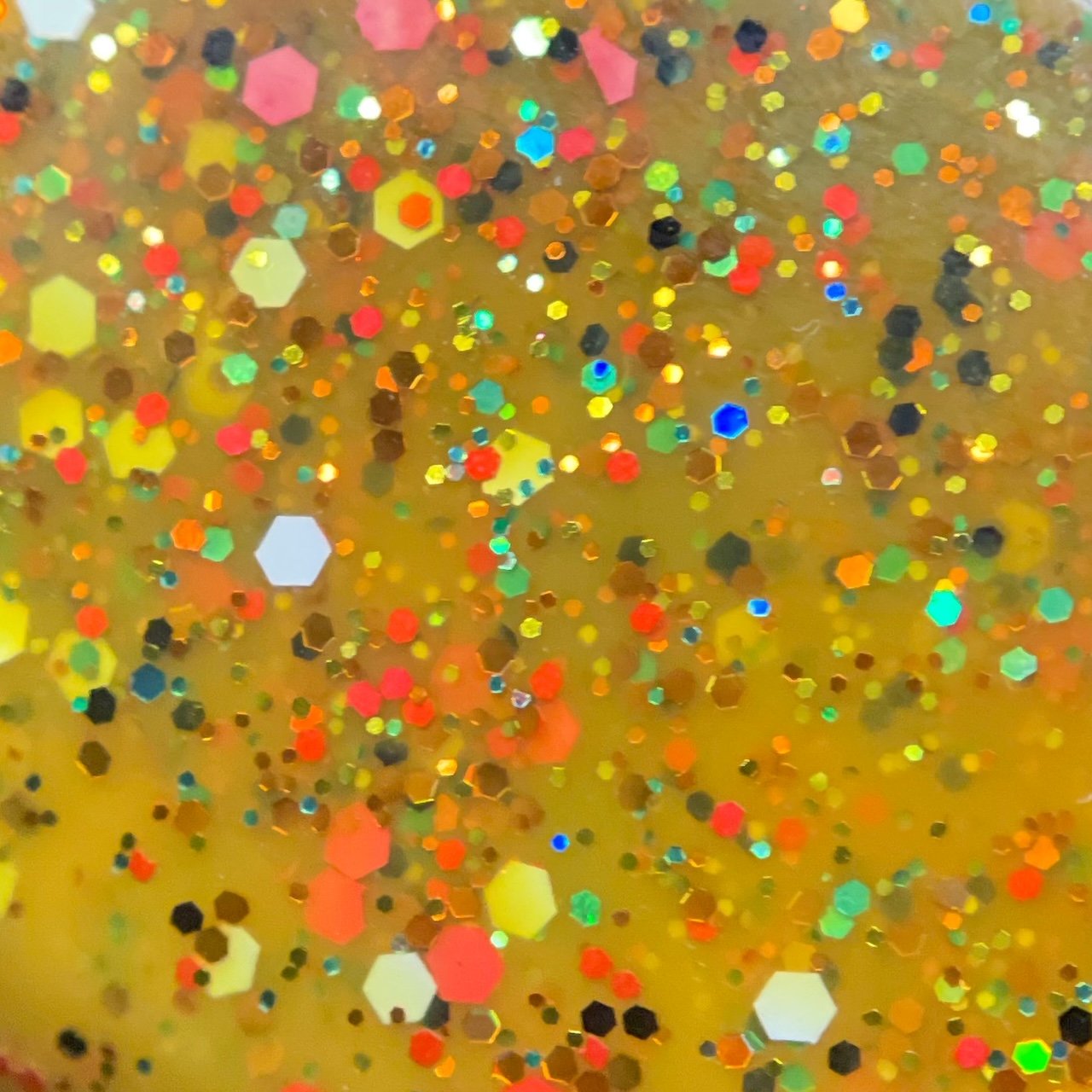 It’s Fall Y’all: a vibrant orange-toned yellow crelly packed with the same glitters as Tropical Pumpkins. This polish is autumn in a bottle.