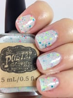 Fruit on Top is a milky white crelly packed with turquoise, watermelon, green, and holo silver glitters of various sizes, and pale lilac shreds. Such a fun color for spring and summer! Opaque in 2-3 coats.