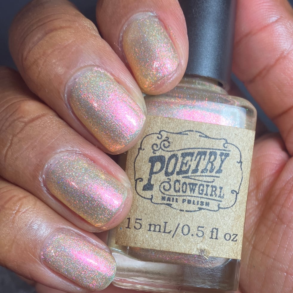 The polish I made for myself to wear on my wedding day. It is a rich, super glowy white-particle iridescent polish that shifts from pink-red-orange-gold-green, with a touch of holo sparkle.