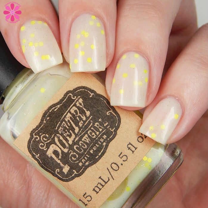 Lemon Fizz is a semi-sheer white crelly with gold micro glitters and larger matte neon yellow glitters. Can be built up for full coverage or layered over your favorite base color!