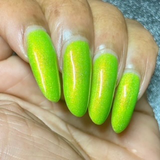 Limelight is a neon lime green with strong red-orange-gold shifting shimmer and a hint of holo sparkle.