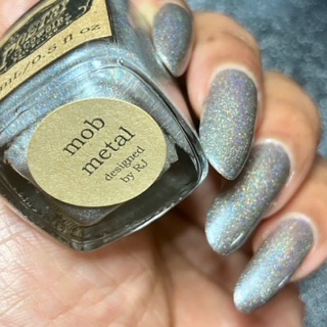 Mob Metal is a gunmetal grey shimmer with holo sparkle, designed by the owner's husband RJ!