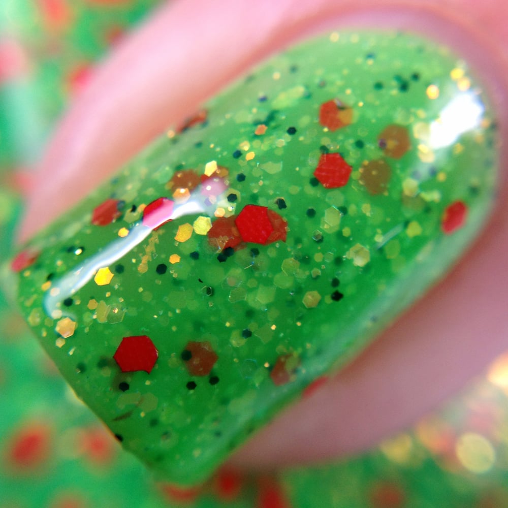Joining the Spooky Spirits Halloween set is Poison Apple, a deep neon green crelly packed with hot orange glitters, orange-green iridescent glitters, and a scattering of black holo micro glitters. Only available through the month of October!