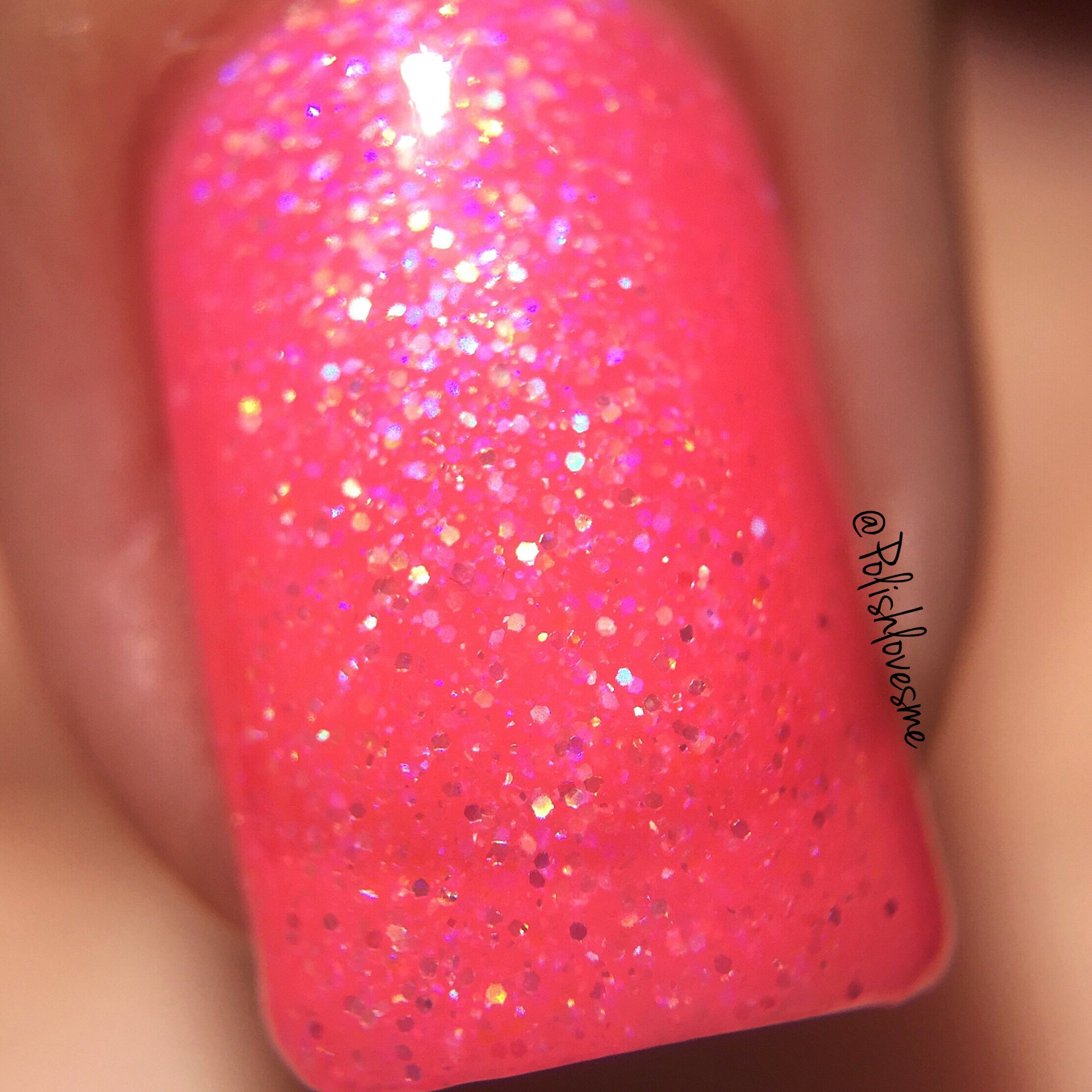 She Drove All Night is a watermelon pink neon jelly packed with iridescent rainbow glitters and flakies.