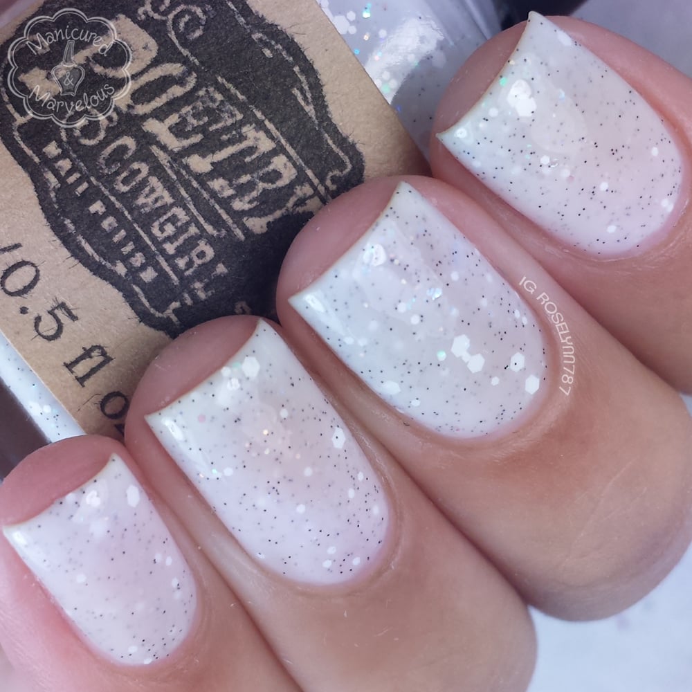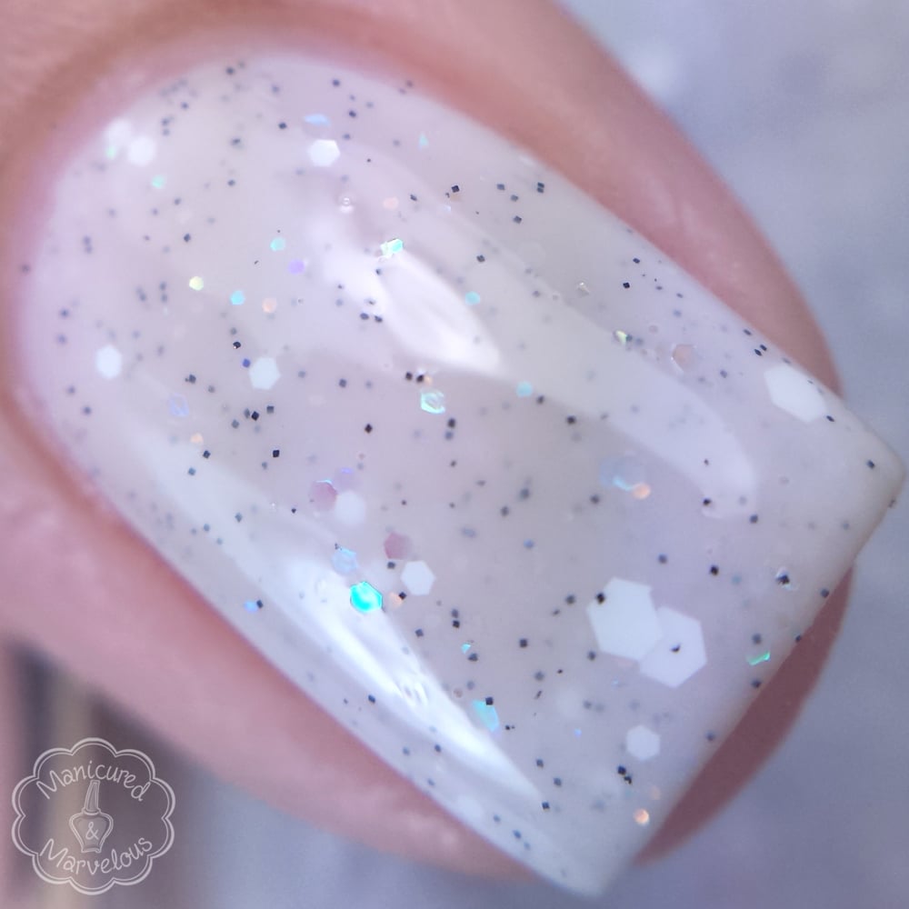 Snowfall is a white crelly packed with white, iridescent, and blue-green shifting iridescent glitters, blue-green shifting iridescent shreds, and a dusting of black micro glitters. It glistens like fresh fallen snow.