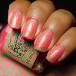 Strawberry Lemonade is a neon pink base packed with gold-orange-green shifting shimmer, red-orange-gold-green iridescent flakies, and a hint of rose gold holo micro glitters