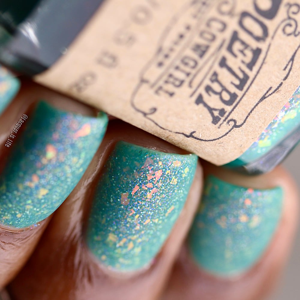 Wicker Park is a deep teal-green packed with blue-purple iridescent micro flakes, pink-green-gold iridescent color shifting flakies, and silver micro glitters.
