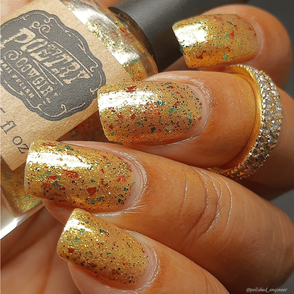 Back for a limited time! Wonder is a gold flakie base loaded with emerald and red glitter shreds and black micro glitters. Can be worn on its own or as a festive topper!